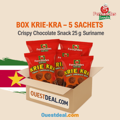 Découvrez le célèbre Krie Krak du Suriname, une collation culte appréciée depuis des générations. Ce snack chocolaté croustillant séduit autant les amateurs de nouvelles saveurs que les connaisseurs nostalgiques. Un petit sachet de 25 g qui vous transporte directement au cœur des marchés et ruelles du Suriname.