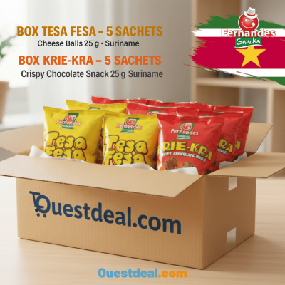 Vous ne connaissez pas encore les snacks surinamais ? Avec cette box Fernandes, découvrez deux pépites locales : les boules de fromage Tesa Fesa et les irrésistibles Krie-Kra au chocolat. Une expérience gustative qui vous transporte directement en Amérique du Sud !