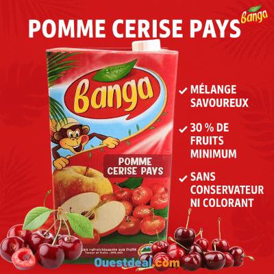 Découvrez le goût unique de la boisson Banga Pomme Cerise Pays, un mélange rafraîchissant qui allie la douceur de la pomme à l’intensité acidulée de la cerise pays, fruit emblématique des Antilles. Avec 30 % minimum de teneur en fruits, cette boisson est parfaite pour toute la famille et idéale pour accompagner vos repas ou simplement vous désaltérer.