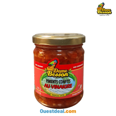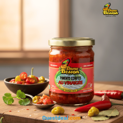 Découvrez l’intensité des Piments Confits au Vinaigre Dame Besson, une préparation traditionnelle antillaise qui marie la puissance des piments antillais et la fraîcheur du vinaigre. Parfaits pour relever vos viandes, poissons, soupes et accompagnements, ces piments vous apportent une explosion de saveurs créoles sans colorant ni conservateur.