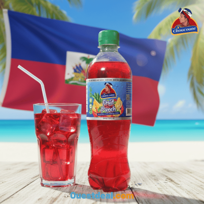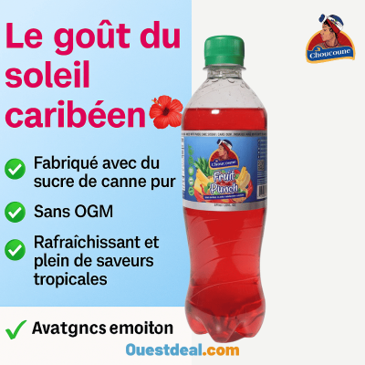 Redécouvrez la fraîcheur tropicale avec Choucoune Fruit Punch, une boisson pétillante fabriquée avec du sucre de canne pur, sans OGM, et aux arômes 100 % naturels. Ce soda fruité combine les saveurs exotiques de l’ananas, de la banane et de la grenadine, rappelant les doux souvenirs des îles.