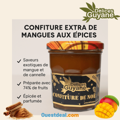 Redécouvrez la magie de Noël avec les saveurs exotiques de la Guyane ! Une confiture artisanale unique à base de mangue et d’épices douces, préparée avec 74 % de fruits pour une texture fondante et un goût ensoleillé. Chaque cuillerée évoque la chaleur des fêtes tropicales.