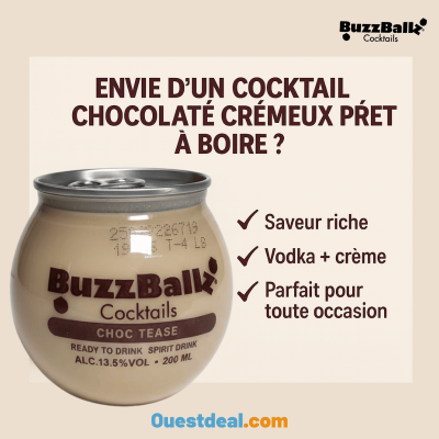 Envie d’un moment gourmand et fun ? Le BuzzBallz Choc Tease est un mini cocktail prêt à boire au chocolat, à base de vodka et de crème. Crémeux, légèrement sucré, à 13,5 % d’alcool, il se déguste bien frais pour une pause douce et réconfortante. Son format boule 200 ml est parfait pour partager, offrir ou savourer en solo.