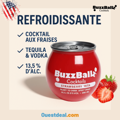 Envie d’une pause fraîcheur comme aux États-Unis ou dans les soirées latines ? Découvrez BuzzBallz Strawberry ‘Rita, le mini cocktail prêt à boire au bon goût de margarita à la fraise… déjà mélangé, déjà glacé, il ne reste plus qu’à savourer.