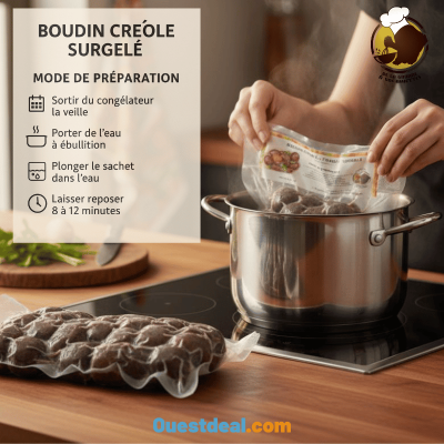 Savourez un boudin créole inspiré de la pure tradition guyanaise. Préparé avec passion et savoir-faire, ce produit surgelé conserve toute la texture moelleuse et le parfum envoûtant des épices locales. Facile à préparer, il se déguste chaud en apéritif, en entrée ou en accompagnement d’un bon riz créole — une véritable invitation à retrouver les saveurs authentiques de la Guyane.