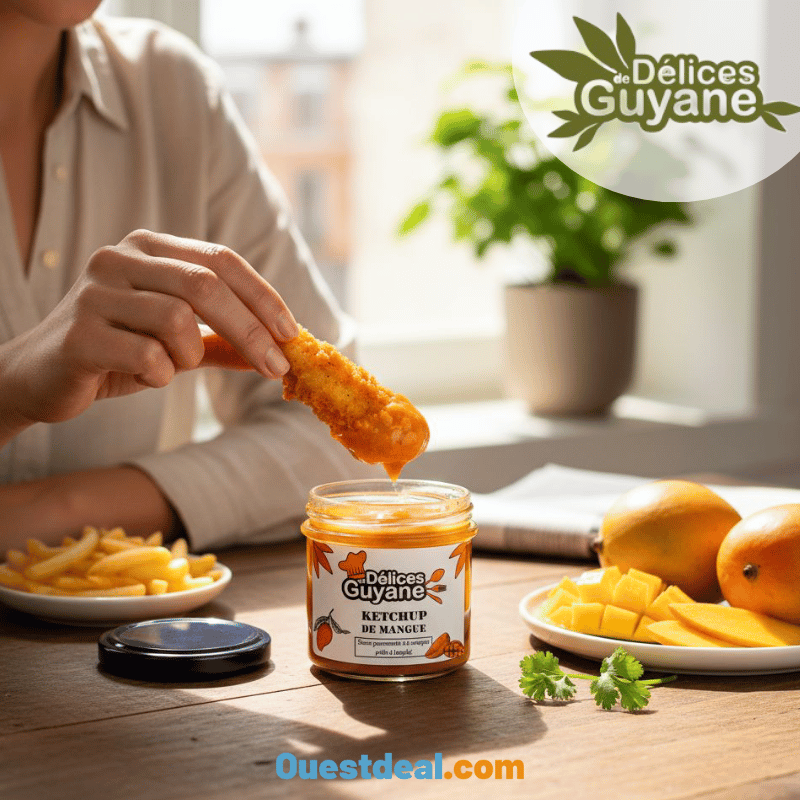 Surprenez vos proches avec un cadeau original et savoureux venu de Guyane ! Le Ketchup de Mangue Délices de Guyane allie le goût envoûtant des mangues mûries au soleil à une texture onctueuse et dorée. Ce ketchup tropical, à la fois sucré et acidulé, est le cadeau parfait pour les fêtes de fin d’année, anniversaires ou paniers gourmands.