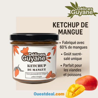 Offrez un cadeau qui a du goût et du soleil ! Le Ketchup de Mangue Délices de Guyane est une sauce artisanale, douce et parfumée, fabriquée avec 60 % de mangues gorgées de soleil. Ce condiment original, à la fois sucré et légèrement acidulé, est parfait pour ajouter une touche tropicale à toutes les assiettes.